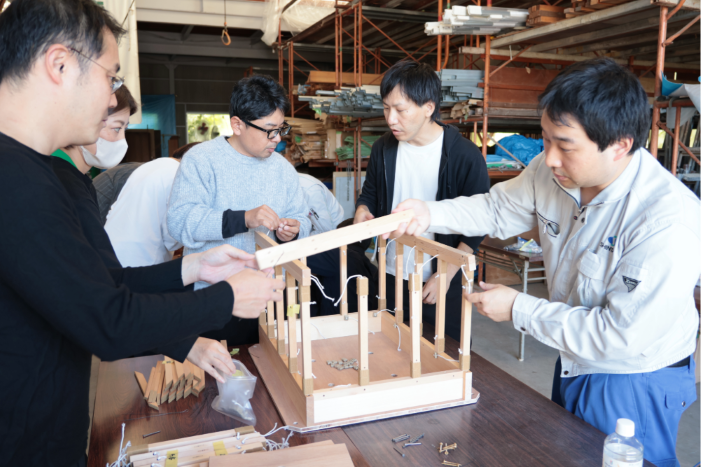 部材の穴に紐を通して連結する作業は思った以上に繊細で、私の班はやや苦戦する場面もありましたが、隣の班は手際よく作業を進めており、思わず感心しました。全員が黙々と集中し、想定していたより早く完成。すぐに加震実験を行ったところ、耐力壁の配置や屋根の重さによって倒壊の挙動が大きく変わる様が見られ、「これはわかりやすい!」とその場が一気に盛り上がりました。